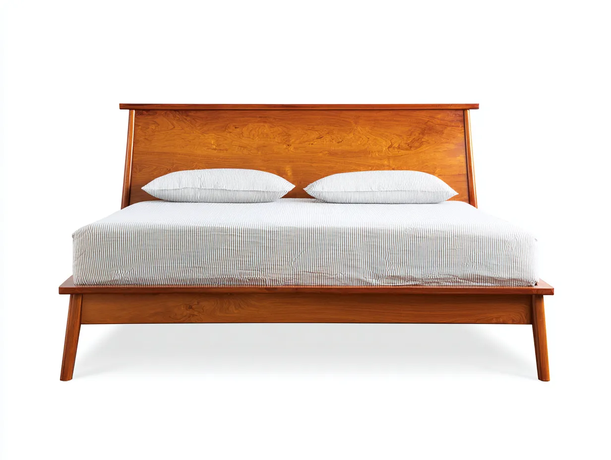 Lit double en bois massif 200 x 180 x 102 cm - brun cerise - pour chambre - mid-century avec tête de lit inclinée et pieds fuselés