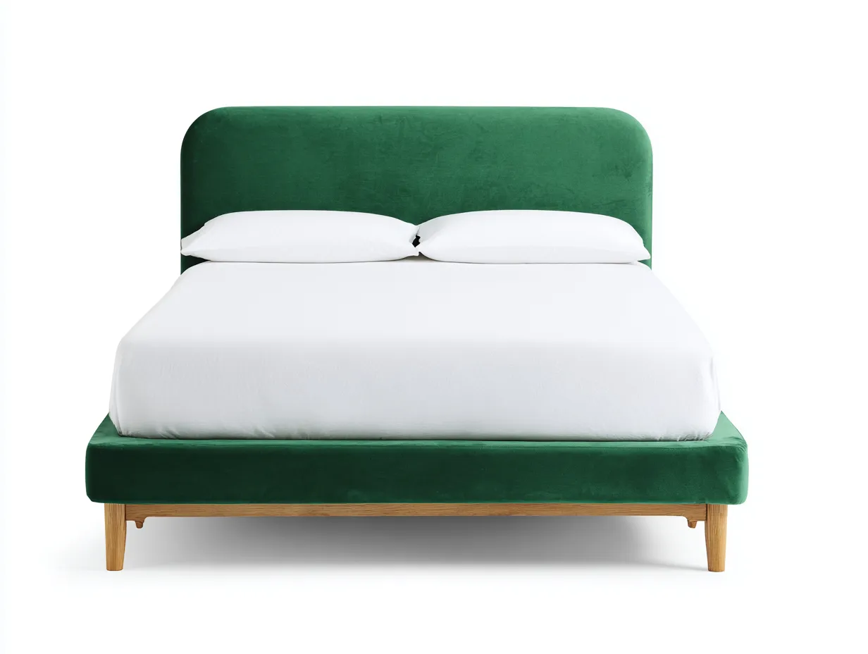 Lit double tapissé en velours 200 x 180 x 112 cm - vert émeraude/bois clair - pour chambre - style moderne avec tête de lit arrondie