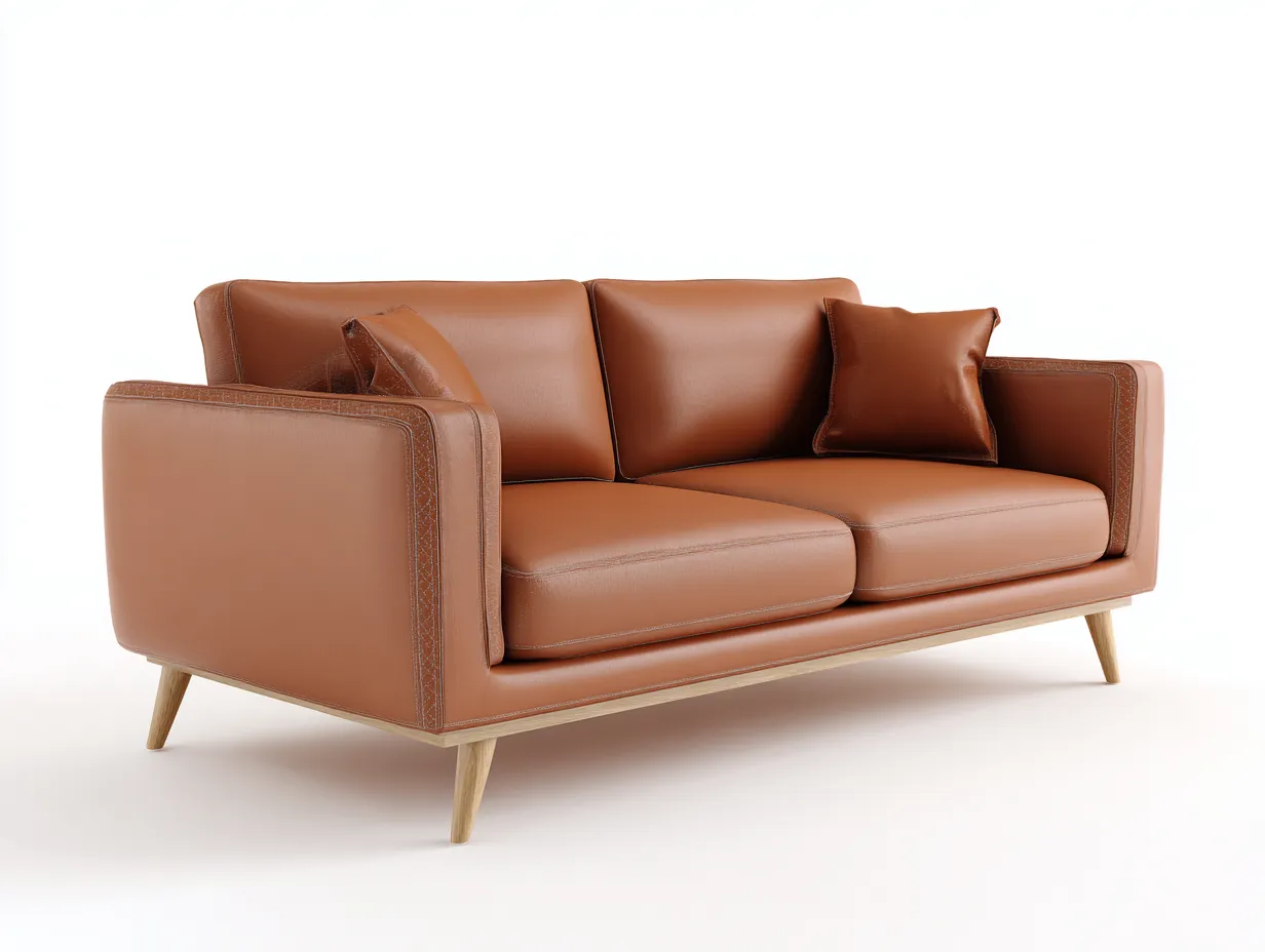 Le revêtement en cuir synthétique de couleur camel offre un toucher souple et une apparence raffinée. Les coutures apparentes soulignent les contours du canapé et renforcent le soin apporté aux finitions. La structure est conçue pour un usage régulier, tandis que la base et les pieds en bois clair apportent stabilité et légèreté visuelle à l ensemble.