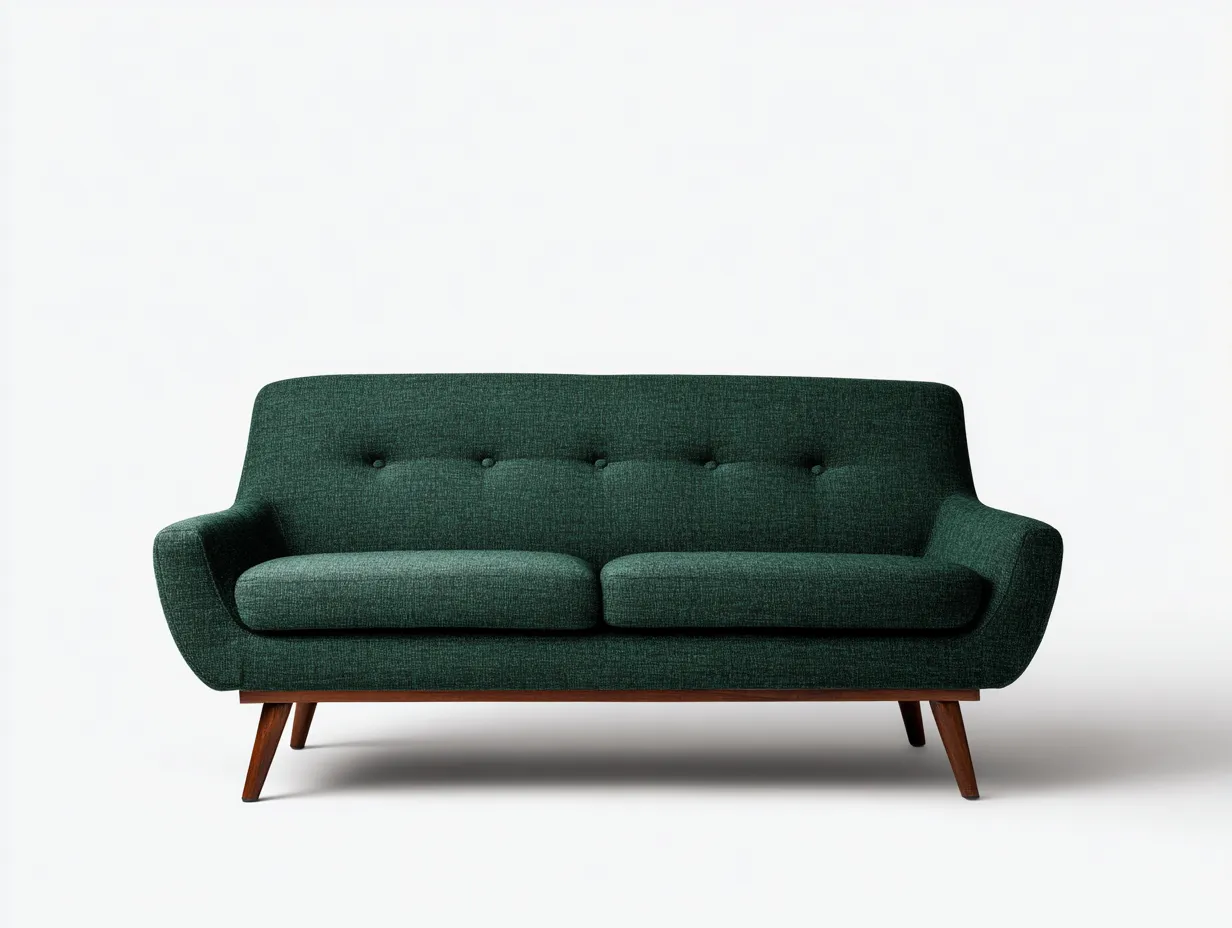 Le revêtement en tissu d ameublement vert foncé présente un aspect texturé sobre qui valorise la profondeur de la couleur. La structure intérieure est conçue pour offrir une bonne stabilité au quotidien, tandis que l assise et le dossier rembourrés favorisent un confort régulier. Le piètement en bois foncé renforce la cohérence visuelle de l ensemble et souligne le caractère chaleureux du canapé.