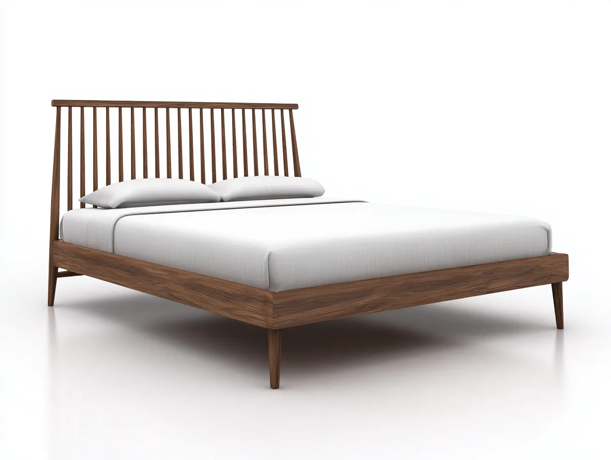 Ce lit double est conçu pour la chambre et séduit par une silhouette légère associée à une présence chaleureuse du bois. La finition noyer met en valeur un veinage naturel et apporte une note élégante qui s'intègre facilement dans des intérieurs modernes, rétro ou inspirés du style mid-century. La tête de lit à barreaux crée un effet visuel aéré et donne au couchage une identité claire sans alourdir l'espace.