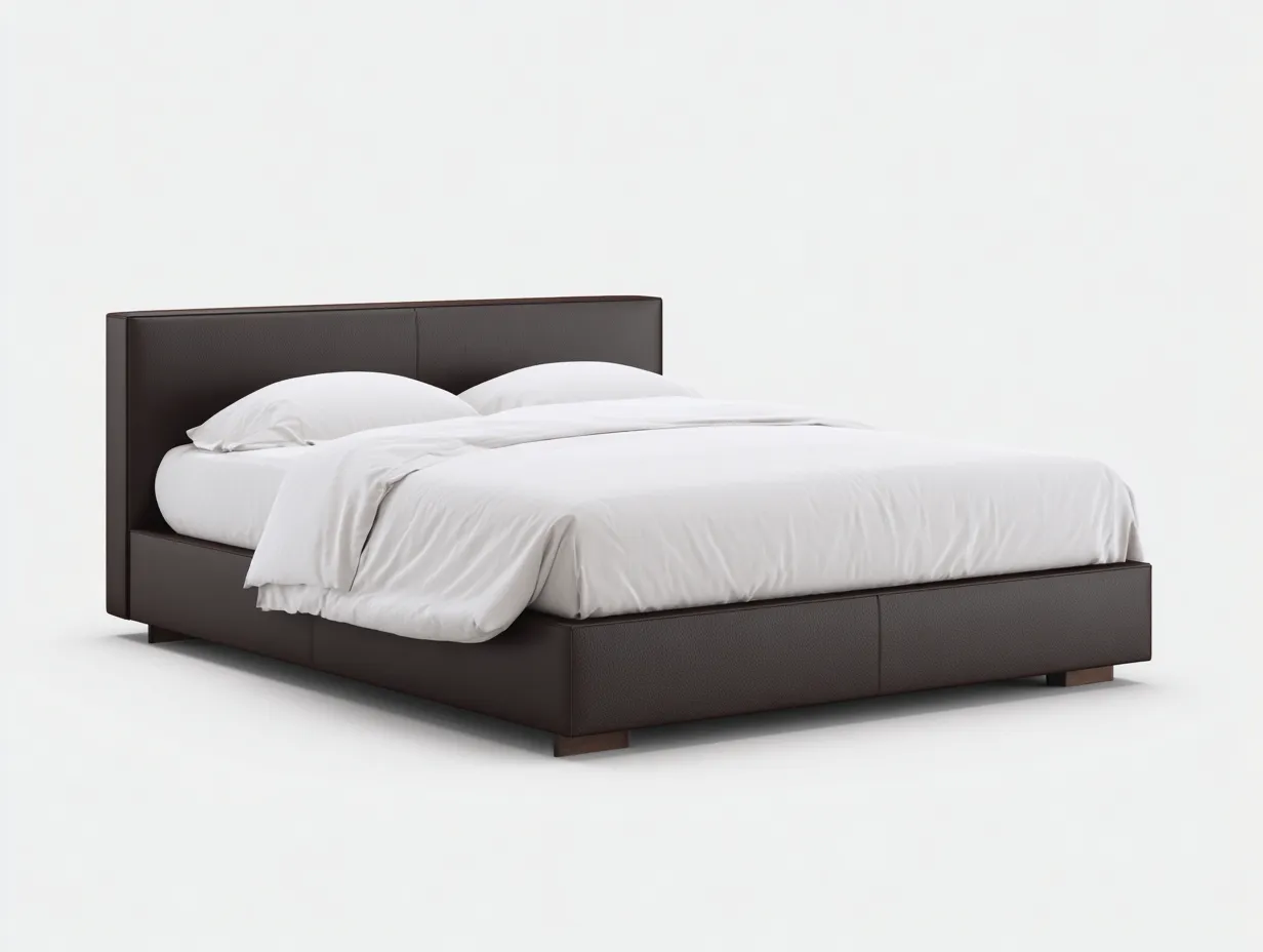 Le lit est habillé d'un similicuir brun foncé avec une texture discrète et une apparence soignée. Le cadre rembourré adoucit l'ensemble tout en renforçant le confort d'utilisation au quotidien. La base stable est pensée pour offrir un soutien fiable et une bonne tenue dans le temps.