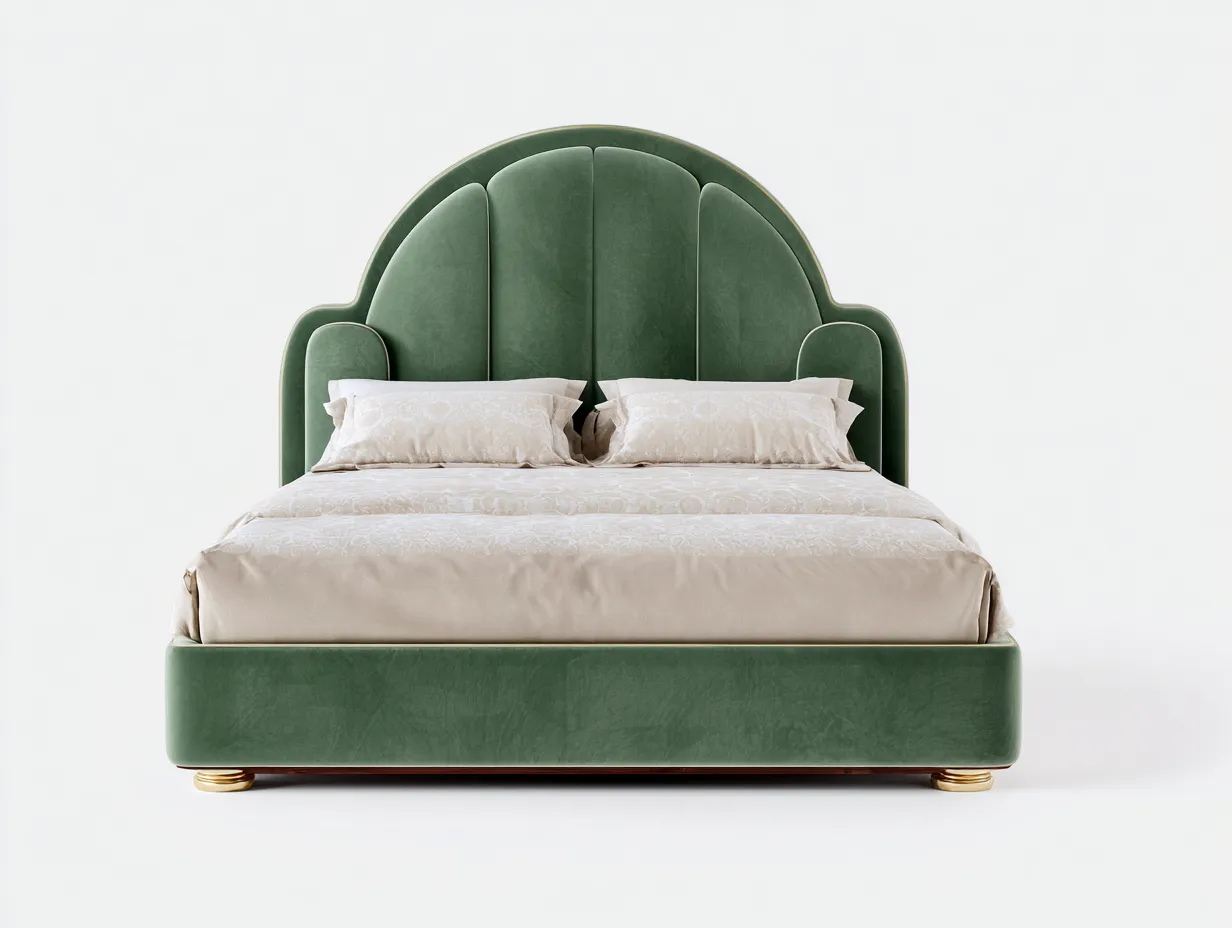 Ce lit double tapissé séduit par sa silhouette enveloppante et sa tête de lit arquée à panneaux, pensée pour structurer élégamment l'espace nuit. Son revêtement en velours vert sauge apporte une finition douce au regard et au toucher, tout en donnant à la chambre une atmosphère feutrée. Le dessin du dossier, associé à des lignes arrondies et à une base généreuse, convient aux intérieurs contemporains recherchant une note décorative inspirée du style art déco sans excès visuel.